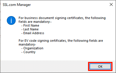 9. A dialog box will appear, listing mandatory fields for document signing and EV code signing certificates. Click the OK button to dismiss the dialog box.