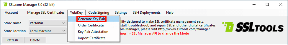 1. Before you order a certificate to be installed on your YubiKey, you must first generate a key pair. If you’ve used SSL Manager in the past you’ll notice that there’s a new YubiKey drop-down menu in version 3.2.
