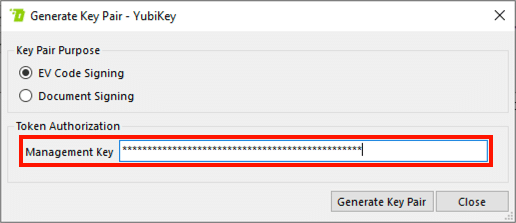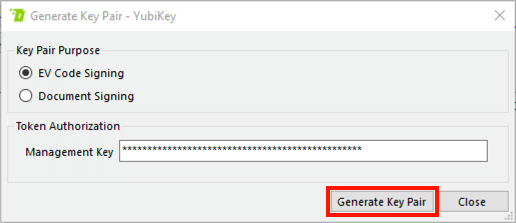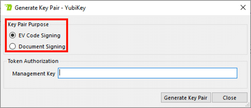 3. The Generate Key Pair dialog box will appear. First, select the purpose for the key pair you are generating. Here, we are going to generate a key pair for EV code signing.