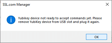 Note: When working with your YubiKey and SSL Manager, you may occasionally see a dialog box letting you know the Yubikey is not ready to accept commands. If this happens, simply unplug the YubiKey, plug it back in, close the dialog box, and repeat the preceding step.