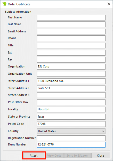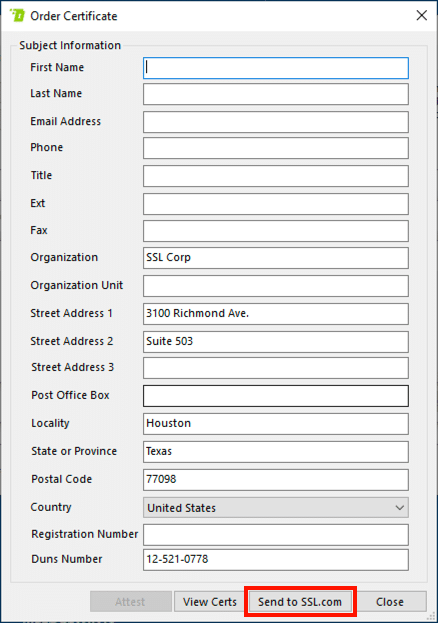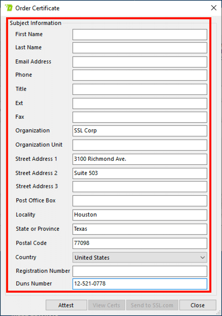 10. Enter the Subject Information for the certificate in the form. Make sure to include all mandatory fields for the type of certificate that you plan to order. In this case, since we are ordering an EV certificate, we’re including information about the company but not an individual person.