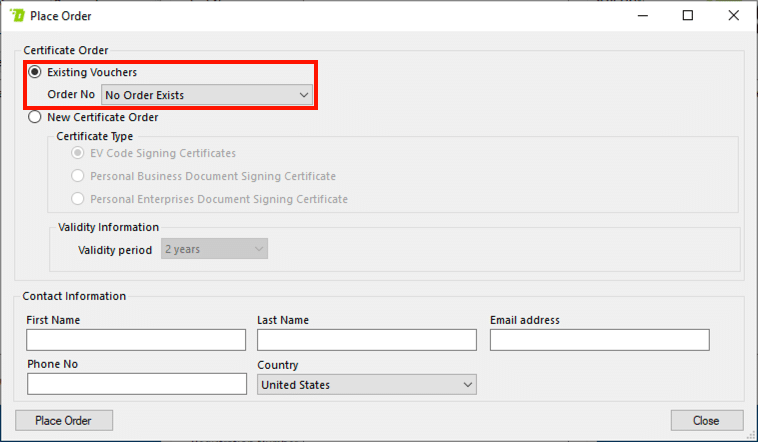 15. The Place Order window will open. If you have any appropriate existing orders available, you can choose one by selecting Existing Vouchers and selecting an order. In our case here there are no existing orders so we’ll make a new one in the next step.