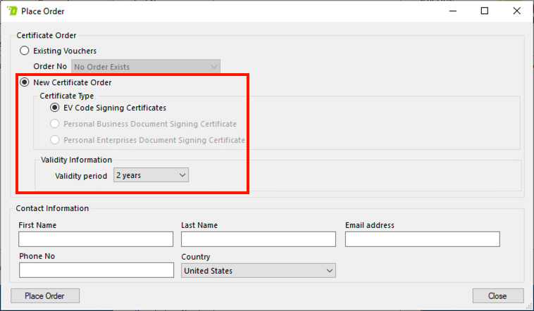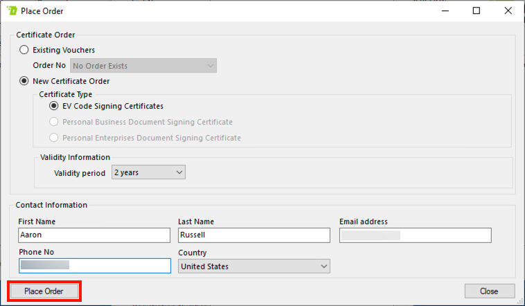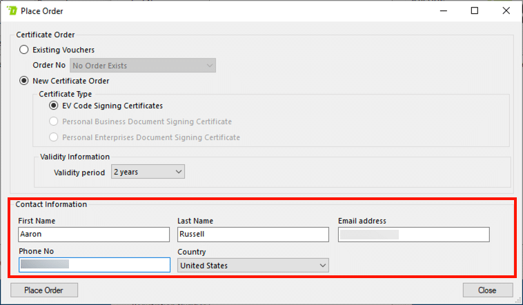 When ordering EV code signing certificates, do not include the First Name and Last Name fields. Otherwise, you will find that the EV code signing option is disabled when placing your order.