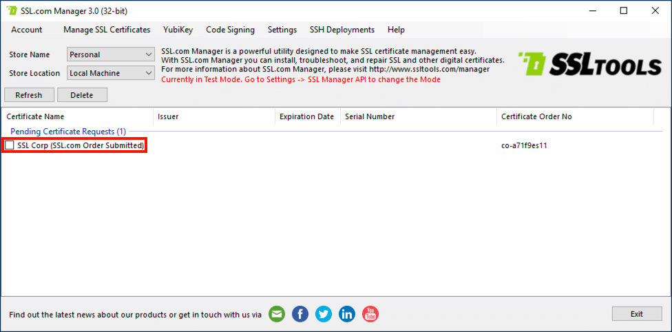 20. Your new order will be shown as pending in the main SSL Manager window.