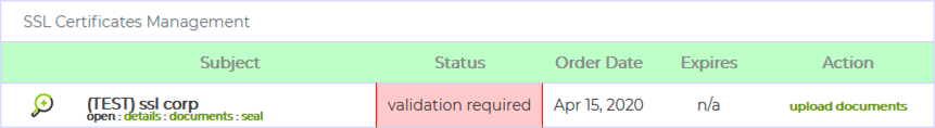 21. If you log into your SSL.com account, you will see that the new order is present, with a status of validation required.