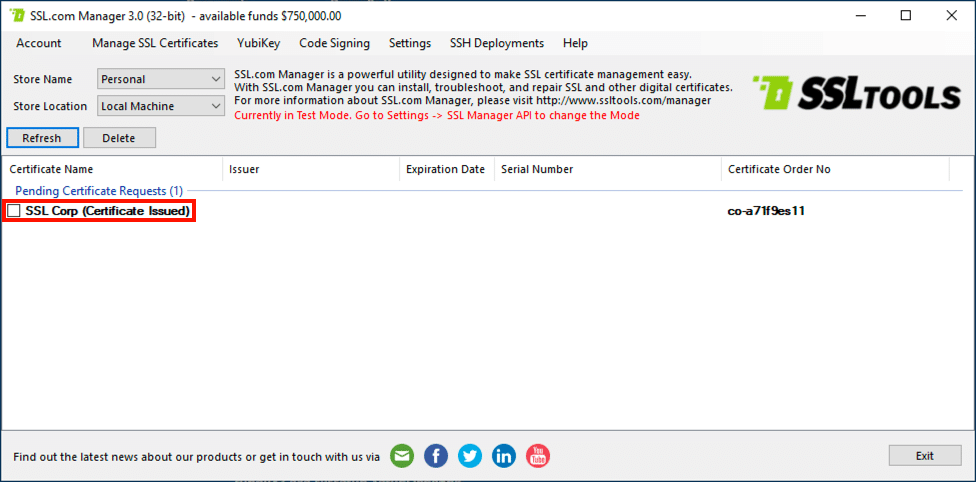 23. When the certificate order as been validated and issued, the order status will change to Certificate Issued in the SSL Manager window.