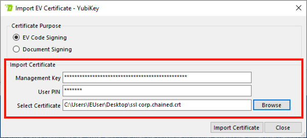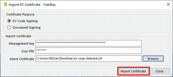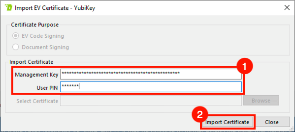 25. Enter your YubiKey’s management key and PIN, then click the Import Certificate button.