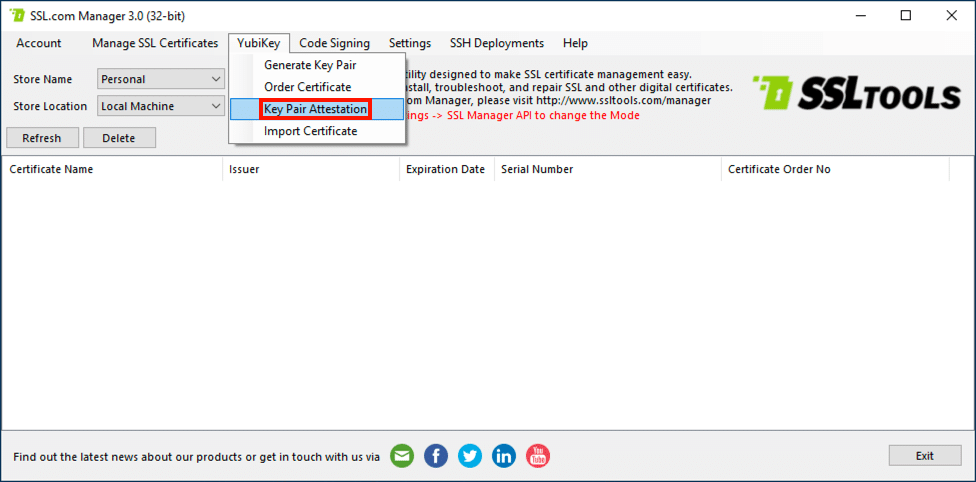 Works with YubiKeyBoth EV code signing and PDF document signing certificates require that your private key be generated and stored on a secure device with two-factor authentication. With the 3.2 update to SSL Manager, SSL.com’s Windows certificate manager, you can generate key pairs directly on a Yubikey FIPS and associate them with SSL.com certificate orders.