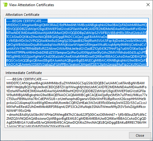 12. A new window will appear with your attestation and intermediate certificates. These can be used with certificate orders in the SSL.com user portal to prove that the key pair was generated on your YubiKey. At this point you can either copy and paste the certificates into a text file for later use, or go directly to the next step in your user account portal.