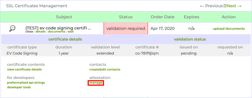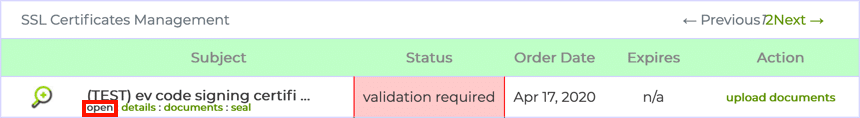 13. The next step is to associate the attestation and intermediate certificates with a certificate order in your SSL.com user account portal. Create a new order or navigate to an existing one, then click the open link.