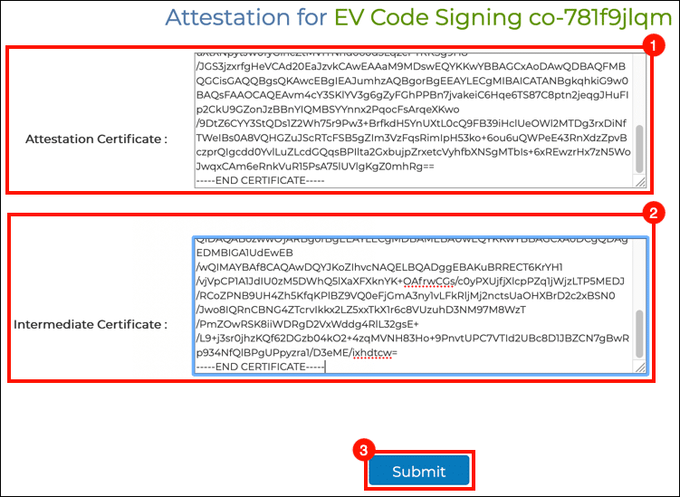 15. Copy and paste your attestation certificate and intermediate certificate into the fields provided, then click the Submit button.