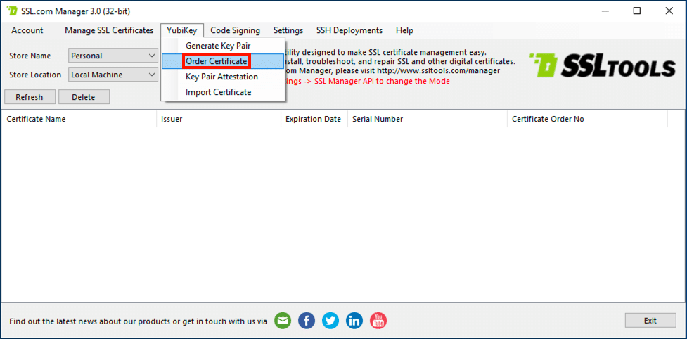 9. At this point, you can choose to submit your certificate order via SSL Manager or your SSL.com user portal account. To use SSL Manager, simply select YubiKey > Order Certificate from the menu, then switch tabs in this how-to and continue from step 9 in the automated submission method.