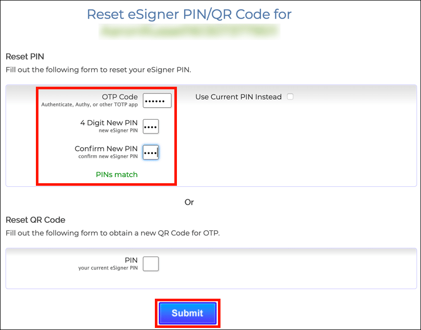 • OTP Method: Under Reset PIN, enter an OTP code from your 2FA app, enter and confirm a new 4-digit PIN, then click the Submit button.