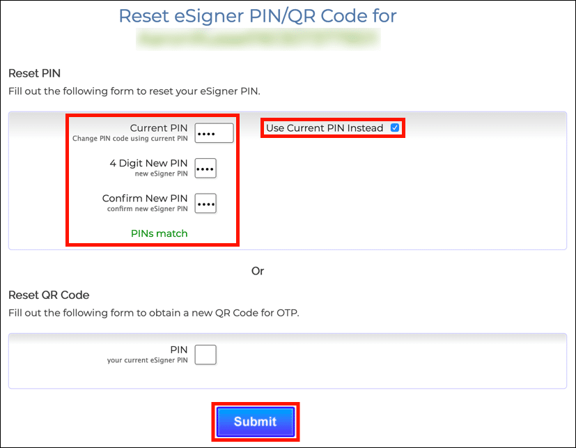 • PIN Method: Under Reset PIN, check Use Current PIN, enter and confirm a new 4-digit PIN, then click the Submit button.