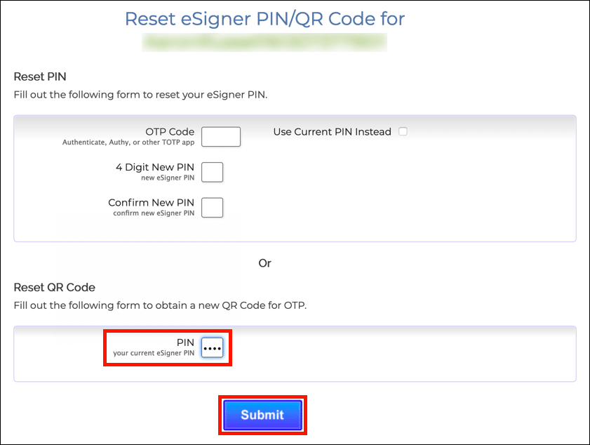 3. Under Reset QR Code, enter your PIN then click the Submit button.